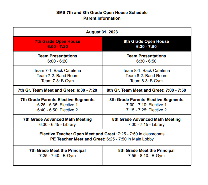 August 31st - 8th Grade Parents : 7:00pm-7:50pm 7th Grade Parents: 6:30pm-7:20pm